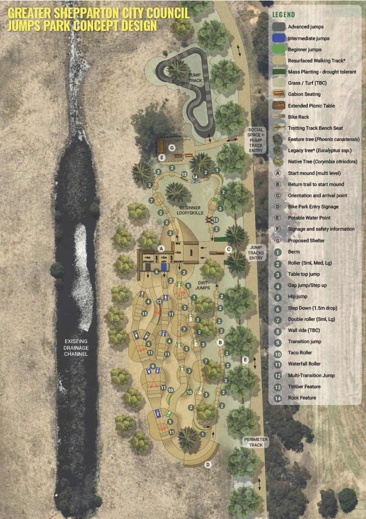 Council is pleased to announce that World Trail Pty. Ltd. has completed the draft concept design for the proposed bike jump park, located at the former Mooroopna Harness Racing Club site (corner of Midland Highway and Elsie Jones Drive).